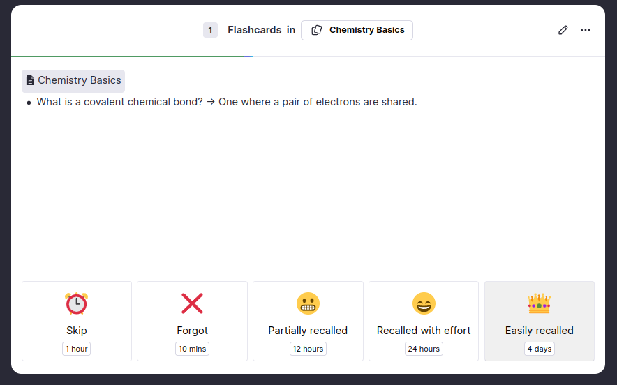 当你遇到想要记住的内容时,输入 == 将其 Rem 转化为一张记忆卡片。== 之前的内容是正面,之后的内容是背面。例如,如果你想记住什么是共价化学键,可以输入: