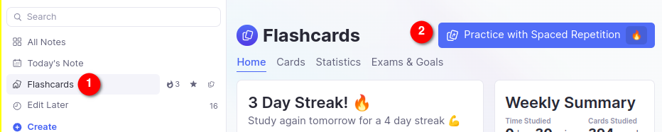 创建记忆卡片后,在左侧边栏选择记忆卡片,点击大大的蓝色使用间隔重复练习按钮来练习它们。