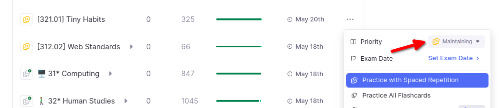 优先练习你最关心的卡片。点击记忆卡片主页中练习按钮旁边的向下箭头,从优先级下拉菜单中选择活跃、维持或暂停。