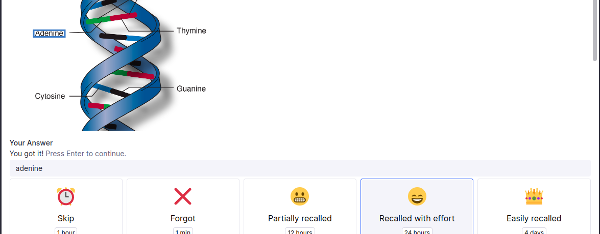• 在队列中键入标签:如果你为某个遮蔽设置了后侧标签(见上面的标签部分),则显示一个要求你填写该标签的键入答案框。如果没有后侧标签但你使用了使用 AI 生成卡片,RemNote 将读取遮蔽下的文本,并将其用作此选项的后侧标签。(如果存在后侧标签,它将覆盖自动确定的文本。)