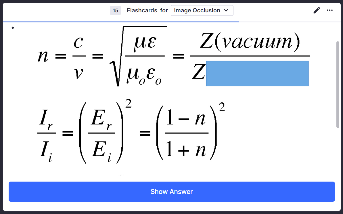 (请注意,你也可以直接在 RemNote 中键入方程式。但是,如果你不想重新输入一个冗长、复杂且没有 LaTeX 源代码的方程式,图像遮蔽方法可能会派上用场。)