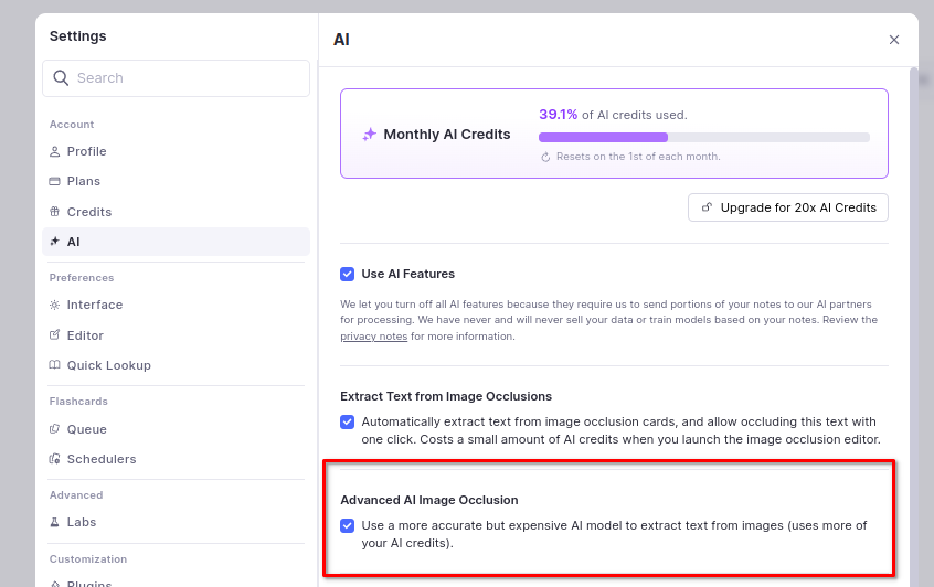 当你启动图像遮蔽编辑器时,模型会自动运行——这使得 RemNote 能够自动识别图像中的所有文本,以便你可以进行搜索。如果你不想为此使用 AI 积分,可以关闭从图像遮蔽中提取文本选项(见上图)。