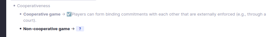 它们形成了两对:游戏要么是合作性的,要么是非合作性的;要么是同时进行的,要么是顺序进行的。从逻辑上讲,这些是相关的。但自然的问题并不是像“关于合作性,游戏有哪两种类型?”我们真正希望的是,测试“合作性”和“非合作性”定义的两张卡片能够一起显示。