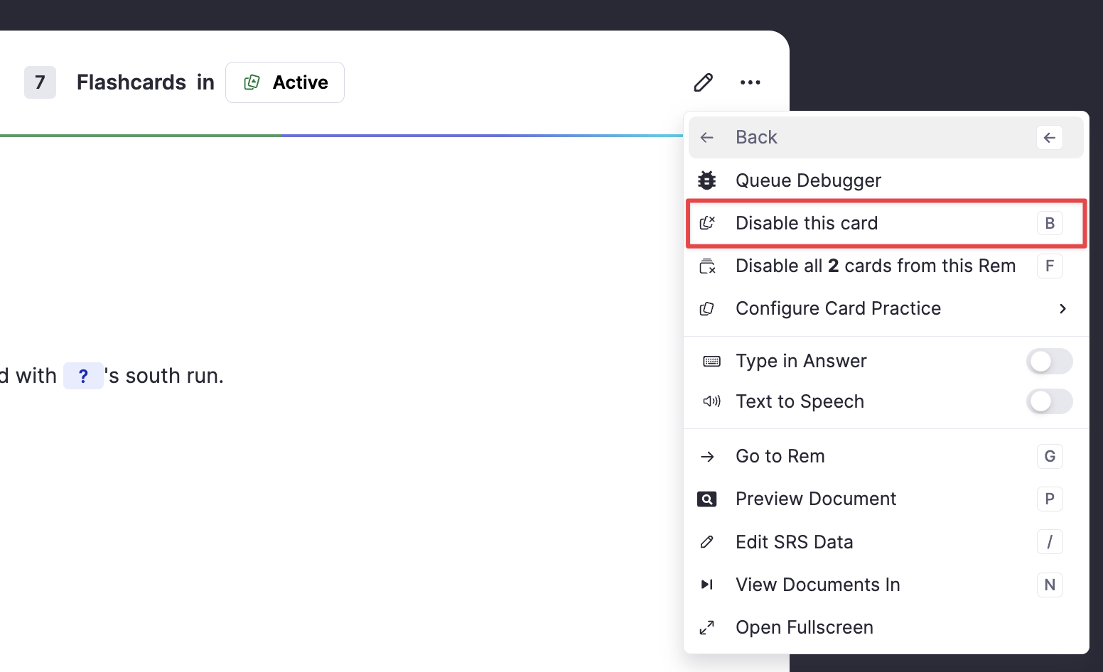 在添加卡片时,通常很难预测哪些卡片会有价值。这意味着即使是 RemNote 专家最终也会在他们的练习队列中留下他们不理解或认为没有价值的卡片。将这些卡片留在你的练习队列中是导致沮丧和时间浪费的根源。因此,在练习时,如果你对某张卡片有“呃”的感觉,或者只是注意到你不再关心记住答案,请考虑从菜单中选择禁用此卡片(或按 B 键)将其从未来的练习会话中移除。该卡片在你的知识库中仍可搜索,你以后随时可以重新启用它。