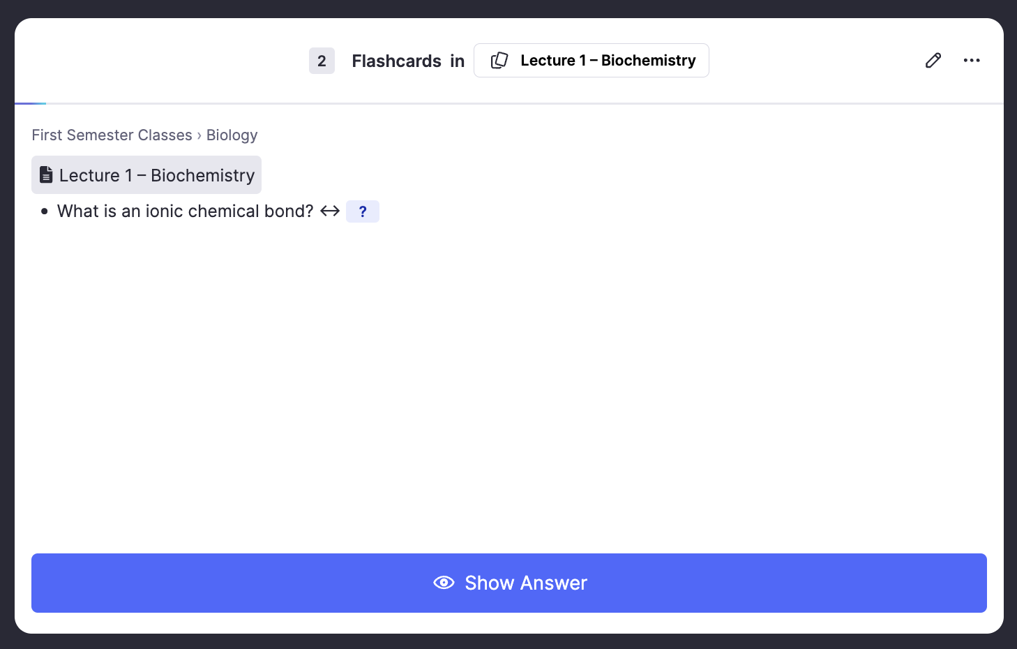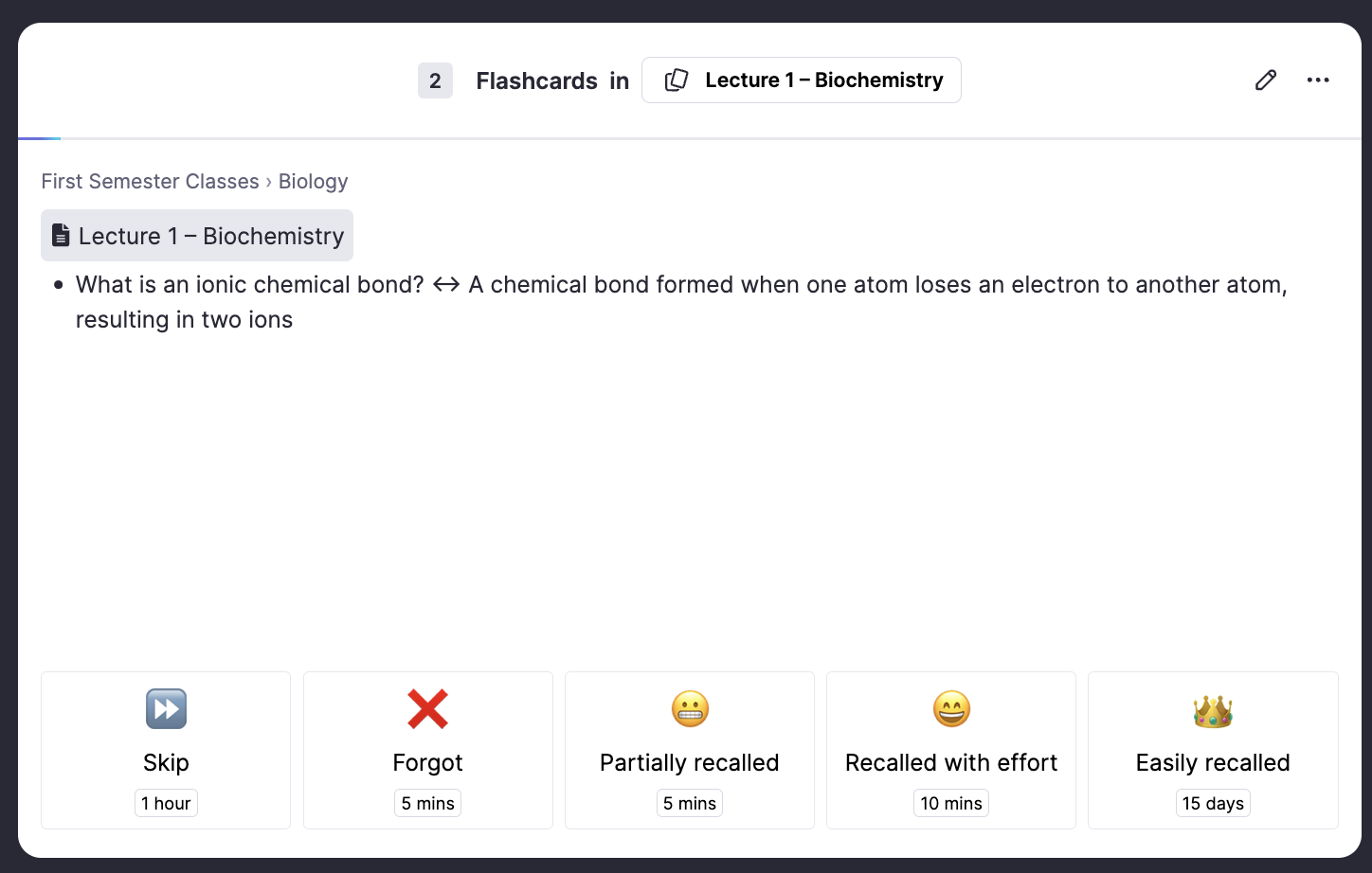 在 RemNote 中,我们通过将想要学习的内容分解成记忆卡片来解决这个问题——可能是通过直接在文档中编写问答对,或者使用概念/描述符框架,或者从RemNote 阅读器中显示的 PDF 或 PowerPoint 复制它们,或者通过 AI 生成它们。无论你使用哪种方法,最终都会得到一系列你想要记住答案的记忆卡片。它们的正面和背面可能看起来像这样: