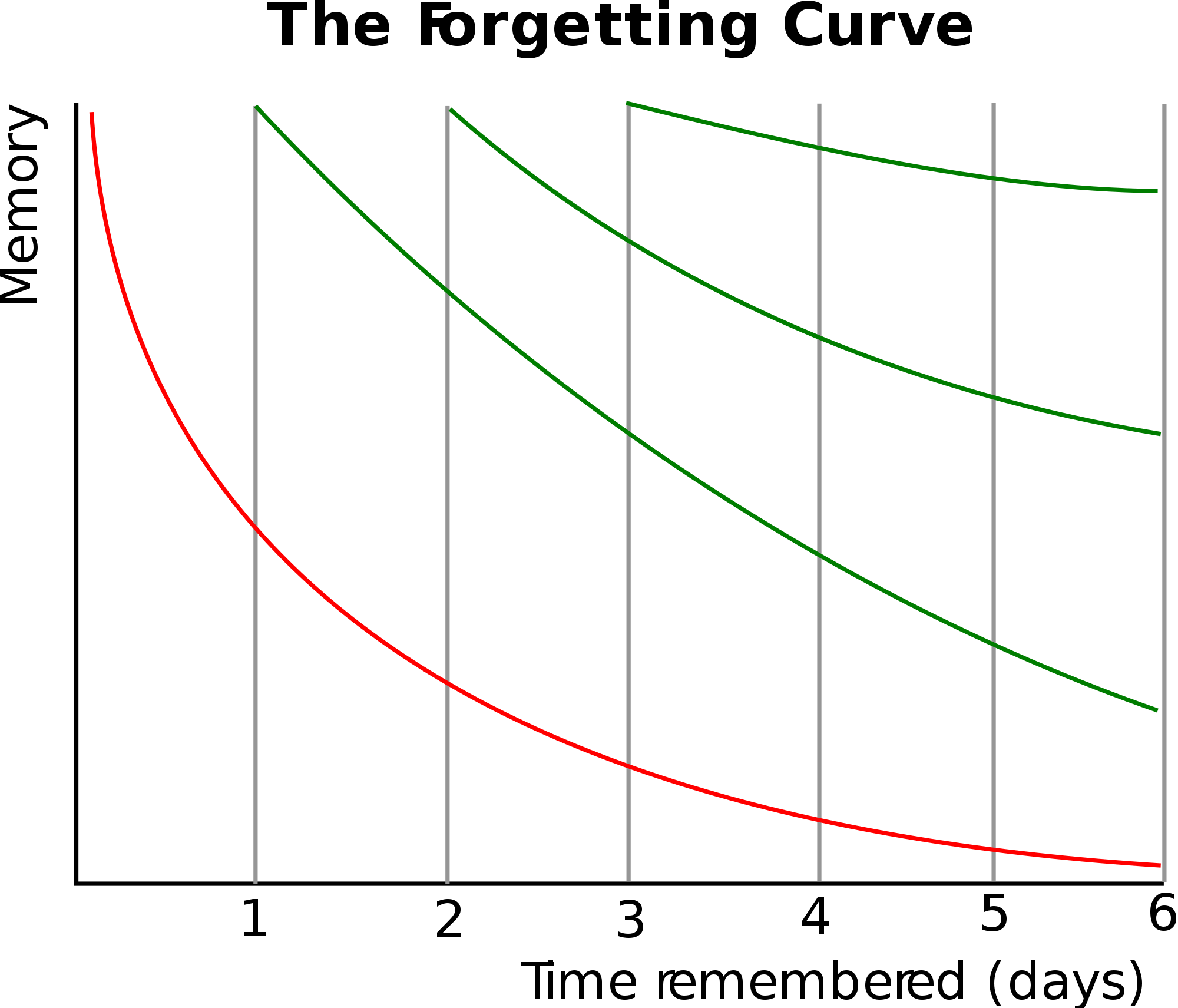 为了回答这个问题,认知心理学家测量了人们遗忘所学内容的速度。当我们绘制某人成功回忆起某事的可能性(y轴)与自上次回忆以来经过的时间(x轴)的关系图时,我们得到一条遗忘曲线,它看起来像下面那条红色(最左边)的线。