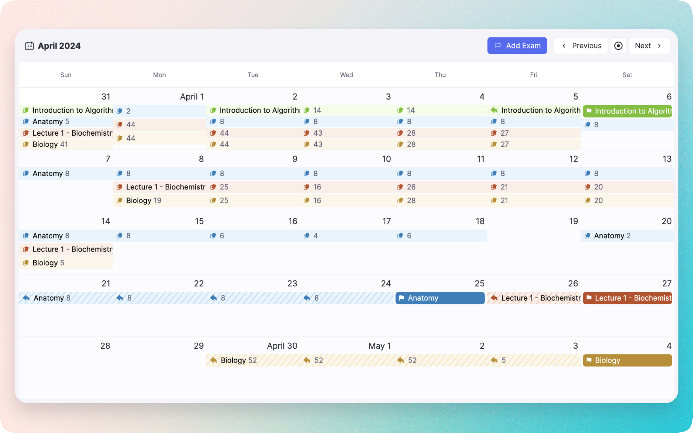 - 临时抱佛脚:发现即将有考试并不得不花几个小时临时抱佛脚并不理想,但我们都有过这样的经历!如果你明天或未来几天有考试,请务必激活考试日程安排器。我们将确保你完全掌握了所有卡片(而不是可能将一些卡片推迟到以后的练习日期),并让你自定义学习时间。