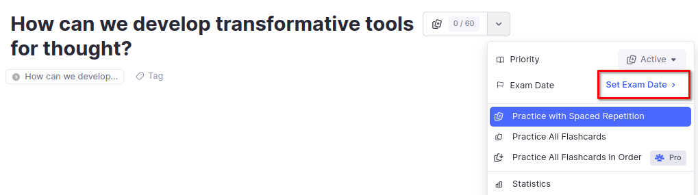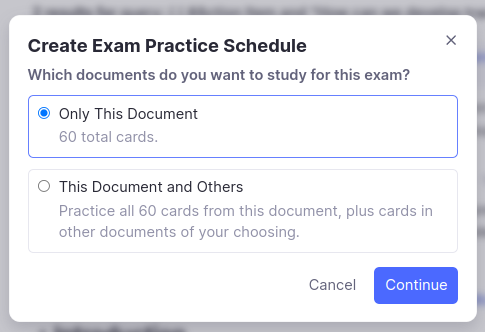 - 优先级:来自考试的卡片在你的全局队列中会被优先处理(也就是说,你会在看到你的活跃卡片之前看到来自考试的卡片),并且在记忆卡片主页的文档列表顶部显示。