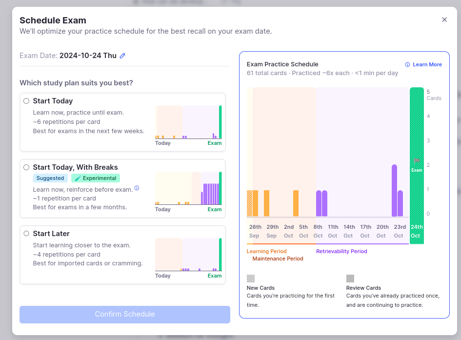 - 今日开始,带间隔:类似于今日开始,但在所有卡片被引入后,我们会让每张卡片的记忆概率在考试临近前有所下降,从而减少期间的练习时间。