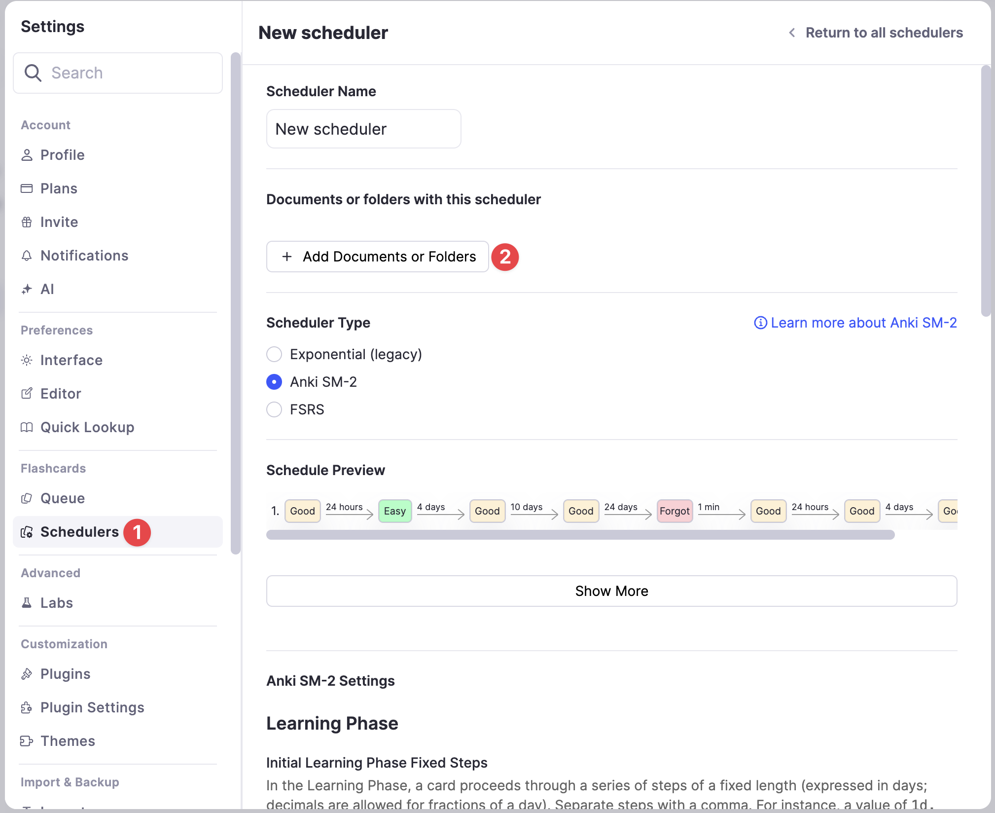 我们建议您在对 RemNote 的工作方式熟悉之前,不要配置自定义调度器,并且应该已经学习了几个月的记忆卡片,您绝不应该更改您不完全理解的设置。配置自定义调度器很容易使您的学习效果变差而不是变好!