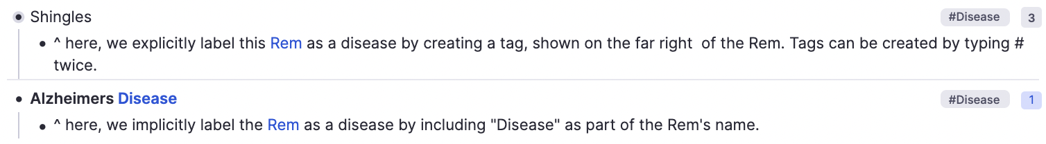RemNote 旨在帮助你以对你有意义的方式来构建知识。实现这一点的一种方式是鼓励你根据每个概念的类型来标记它。例如,如果你正在学习带状疱疹,将带状疱疹明确标记为一种疾病是很有用的。在 RemNote 中,你可以通过用“疾病”标签标记 Rem,或者在 Rem 名称末尾添加对“疾病”的引用来轻松建立这种联系。