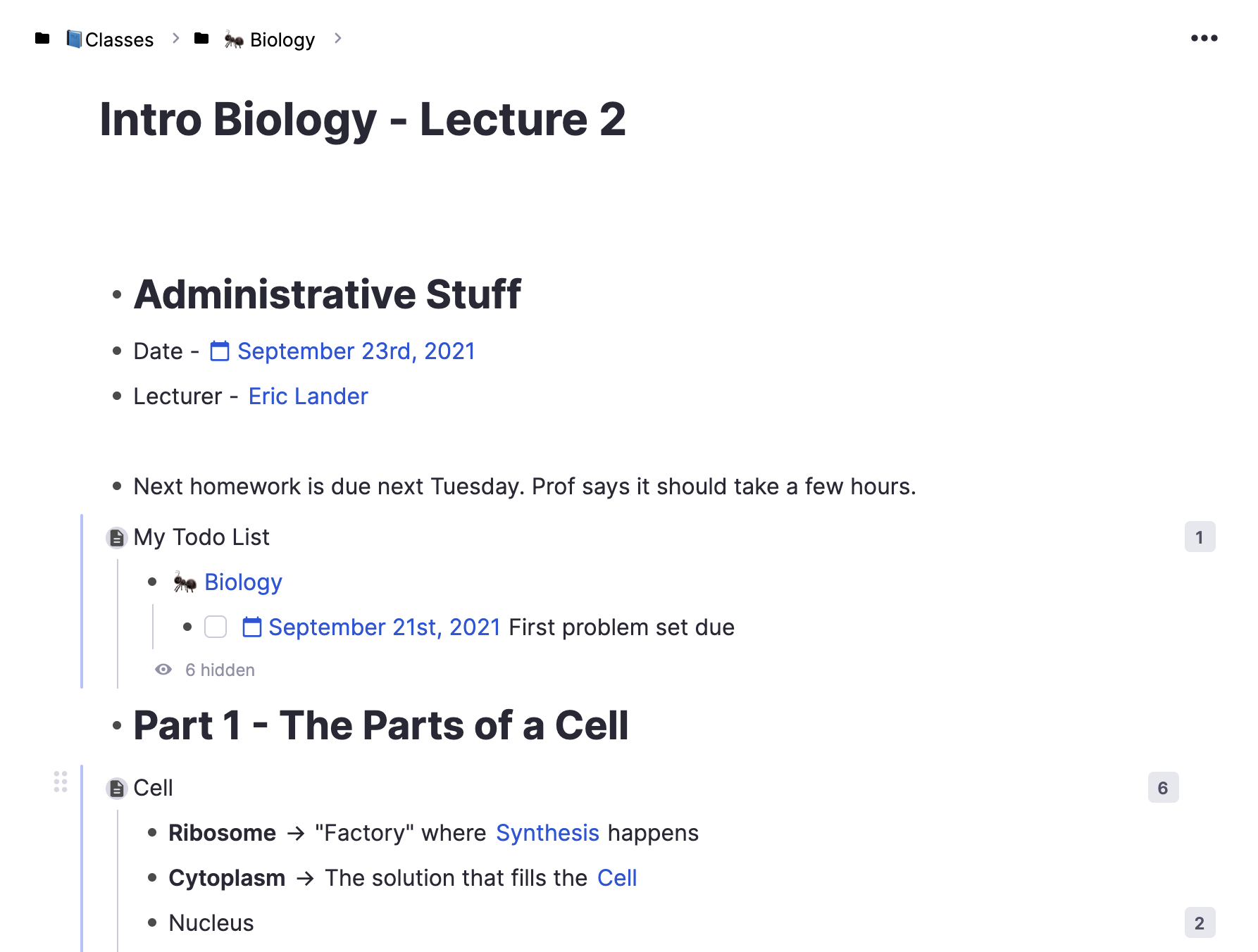 理解一个系统的一种方法是将其分解为组件,然后将这些组件分解为更多的组件。RemNote 通过允许你将概念嵌套到任意深度来帮助你做到这一点。你可以在上面的任何示例中看到这种层次结构。