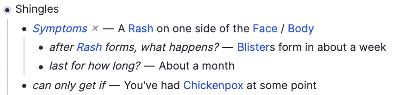 在 RemNote 中,你可以为每个症状创建 Rem 引用。然后,你以后将能够找到诸如“我知道的所有具有这种症状的疾病是什么?”这类问题的答案。此外,你可以链接和串联知识。例如,你可以确保带状疱疹与水痘相关联(如果你想理解带状疱疹,这在心智上需要如此)。在 RemNote 中,你所有的知识都像在你大脑中一样,在一个知识库中相互关联。