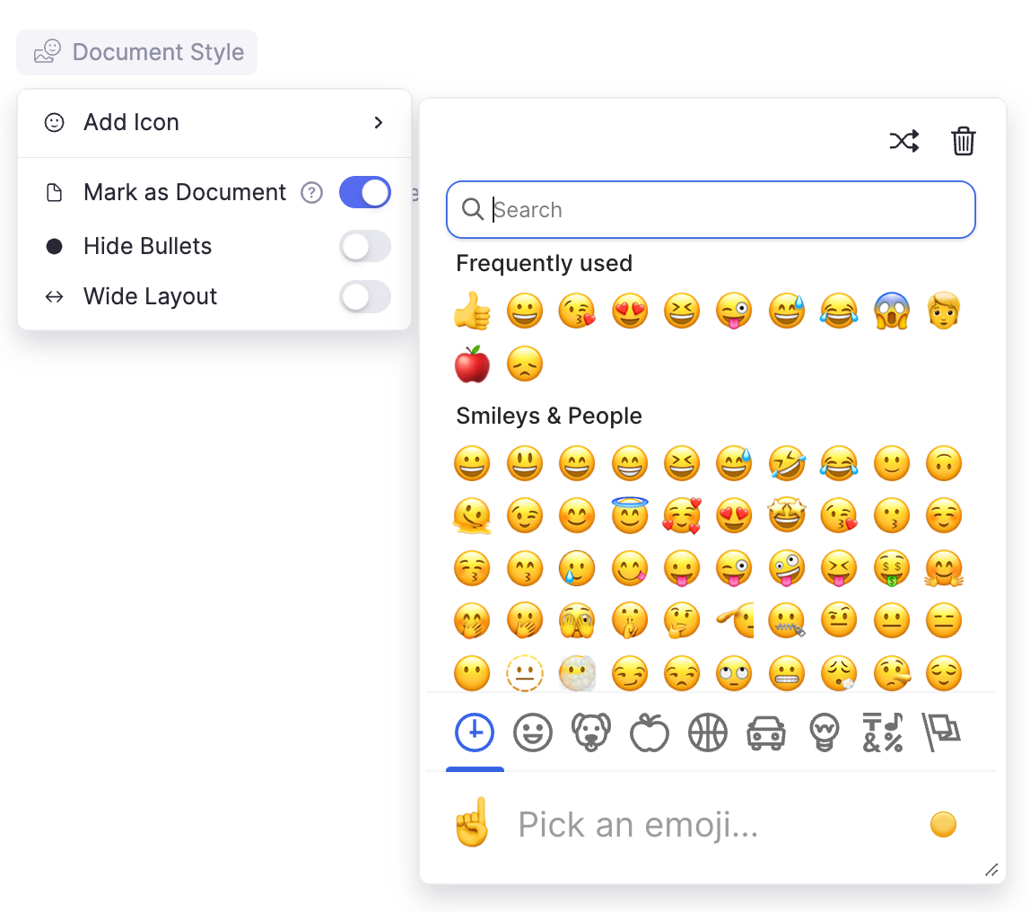 为了更容易找到你正在寻找的文档,你可以为文档分配一个表情符号。为此,请先聚焦到该文档,然后从文档样式菜单中选择添加图标。