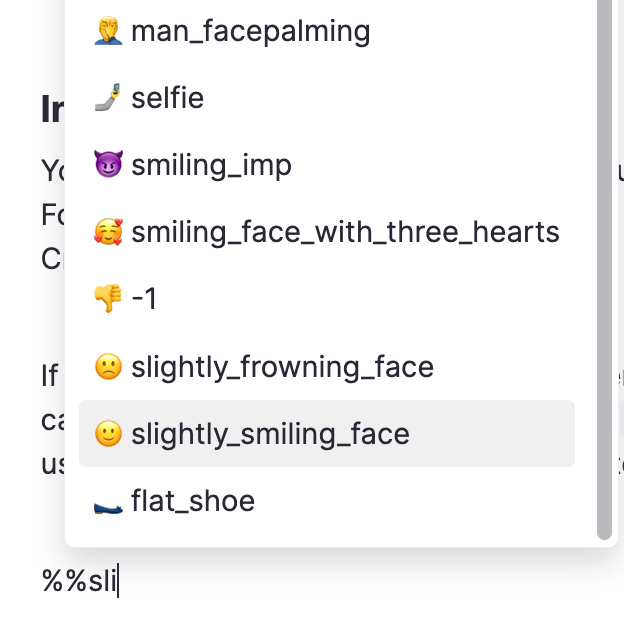 如果你的设备没有方便的表情符号插入器,RemNote 也内置了一个,你可以通过输入 %% 来访问。输入 %% 后,搜索你想要使用的表情符号名称,然后使用方向键选择合适的一项并按 Enter 键插入。