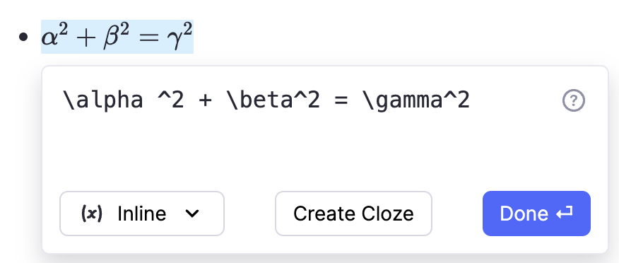 如果你想在数学或化学方程式中使用希腊字母,可以改用 LaTeX:输入 $$ 或 /latex,然后使用 LaTeX \macros 将数学/化学文本写入或粘贴到 LaTeX 方程字段弹出窗口中。