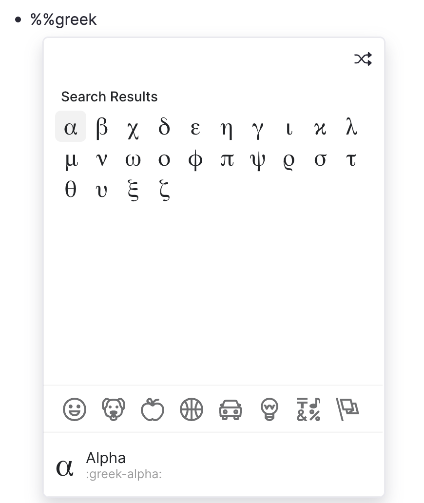 或者,你也可以使用表情符号插入器,它也支持希腊字母。通过输入 %% 并搜索你想要使用的字母名称来访问表情符号插入器。
