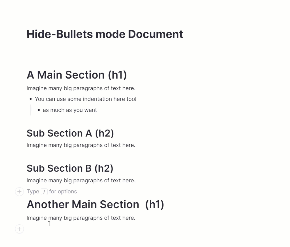 文档有一个特殊的隐藏项目符号模式,它不仅会隐藏其直接子项的项目符号,还会改变编辑器的某些行为,以获得更好的长篇写作体验。