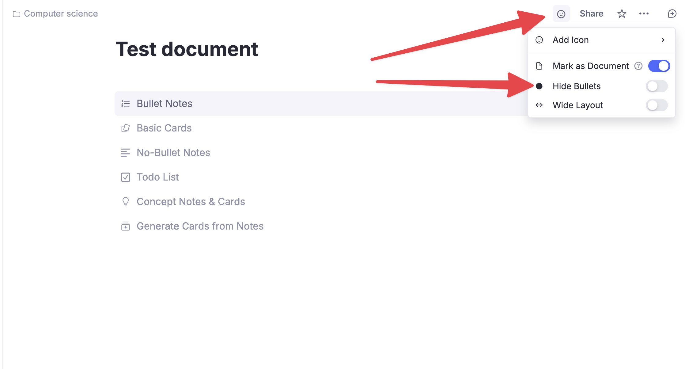 当聚焦到一个文档时,打开文档菜单(笑脸图标)并选择“隐藏项目符号”。