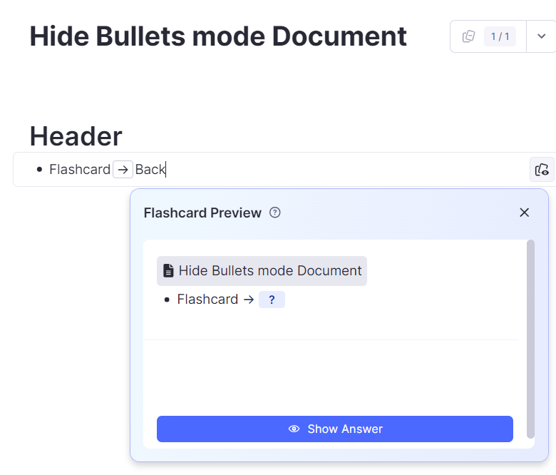 如果你在这样的文档中创建记忆卡片,即使你按 Tab 键在标题下方显示一个项目符号点,标题也不会出现在记忆卡片中,因为它们实际上处于相同的层级。因此,我们通常不建议对将包含许多记忆卡片的文档使用隐藏项目符号模式,因为能够轻松理解层级关系对于预测记忆卡片在队列中的显示方式至关重要。