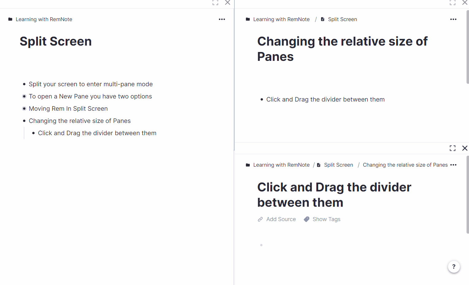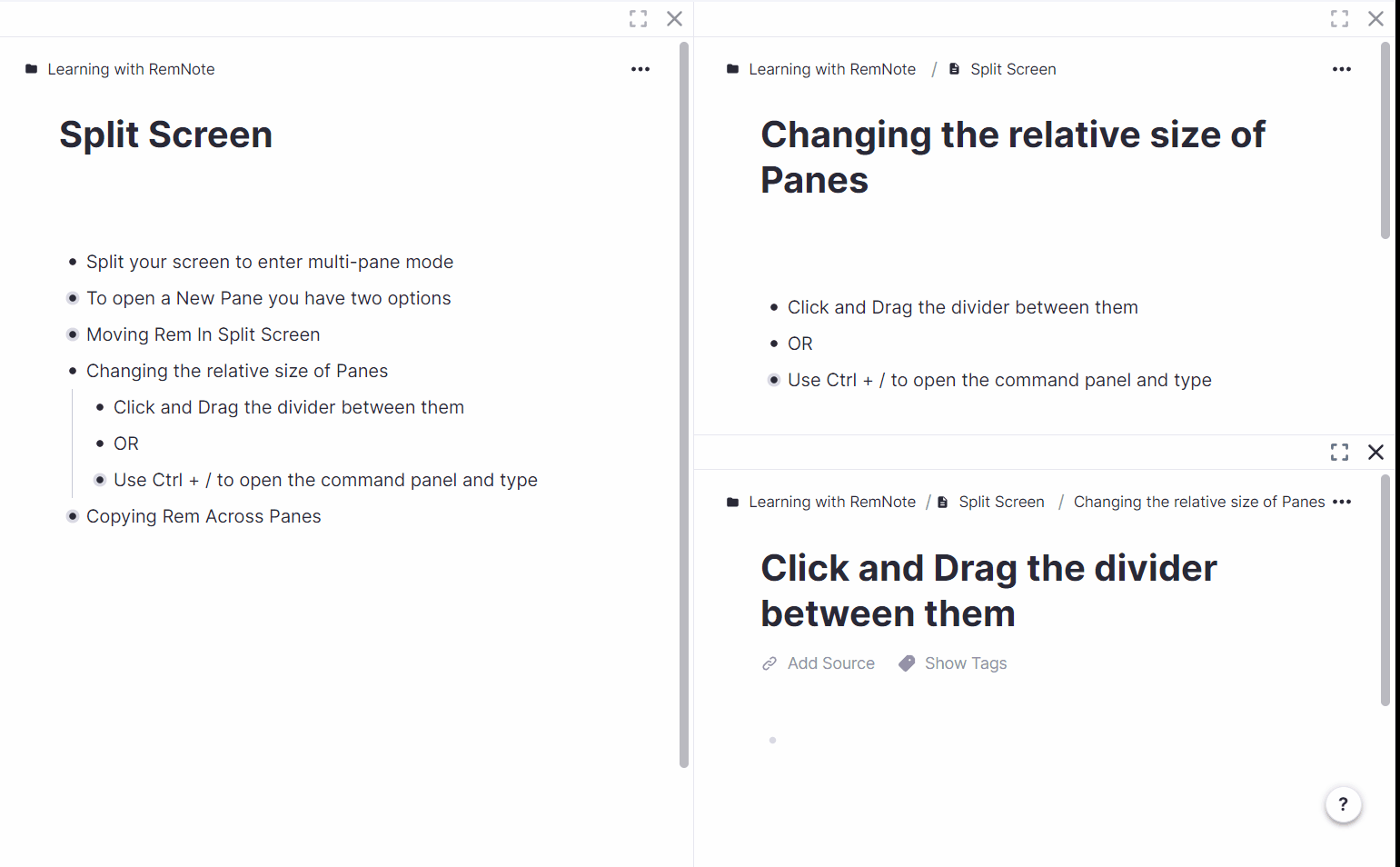 使用上述任一方法,你可以打开更多窗格,直到所需内容全部显示在视图中;每次 RemNote 都会按照与上次分割相反的方向分割当前窗格。