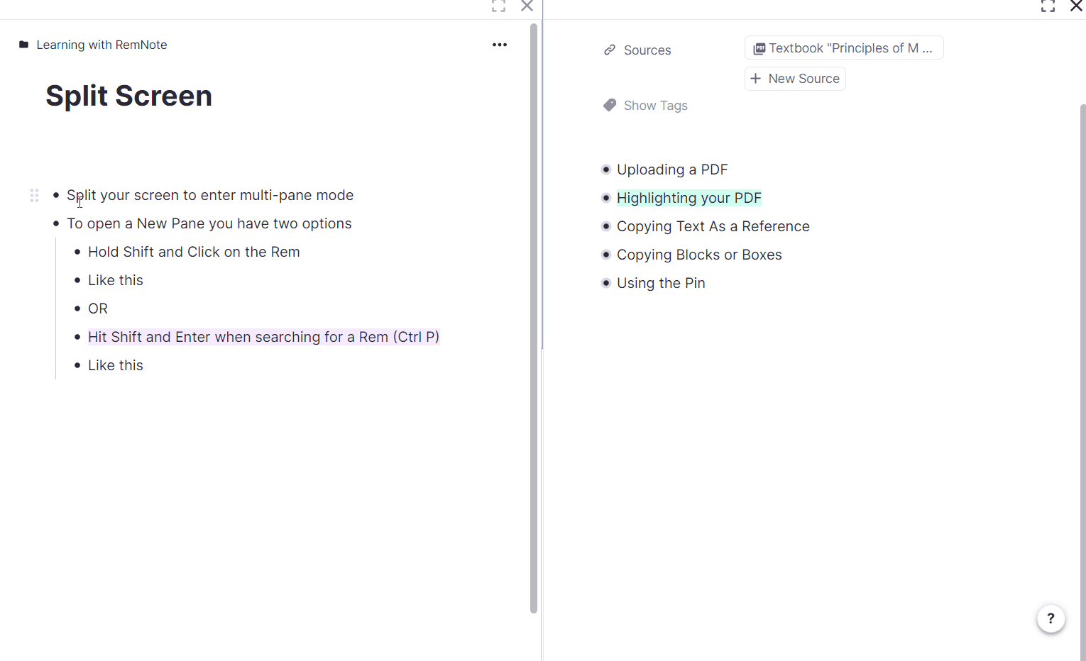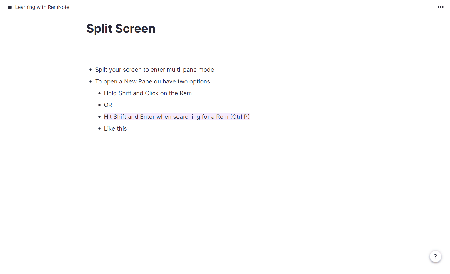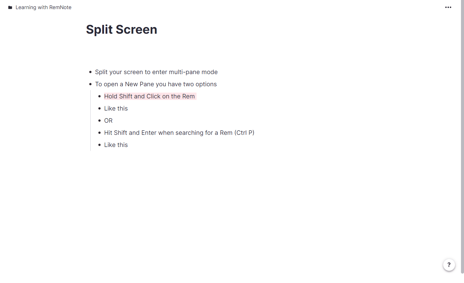 在浏览笔记时,你可以按住 Shift 键并点击任何项目符号或 Rem 引用以在新窗格中打开它。这同样适用于侧边栏上显示的文档。