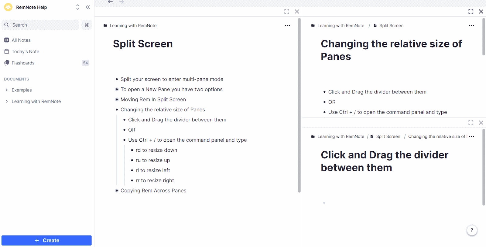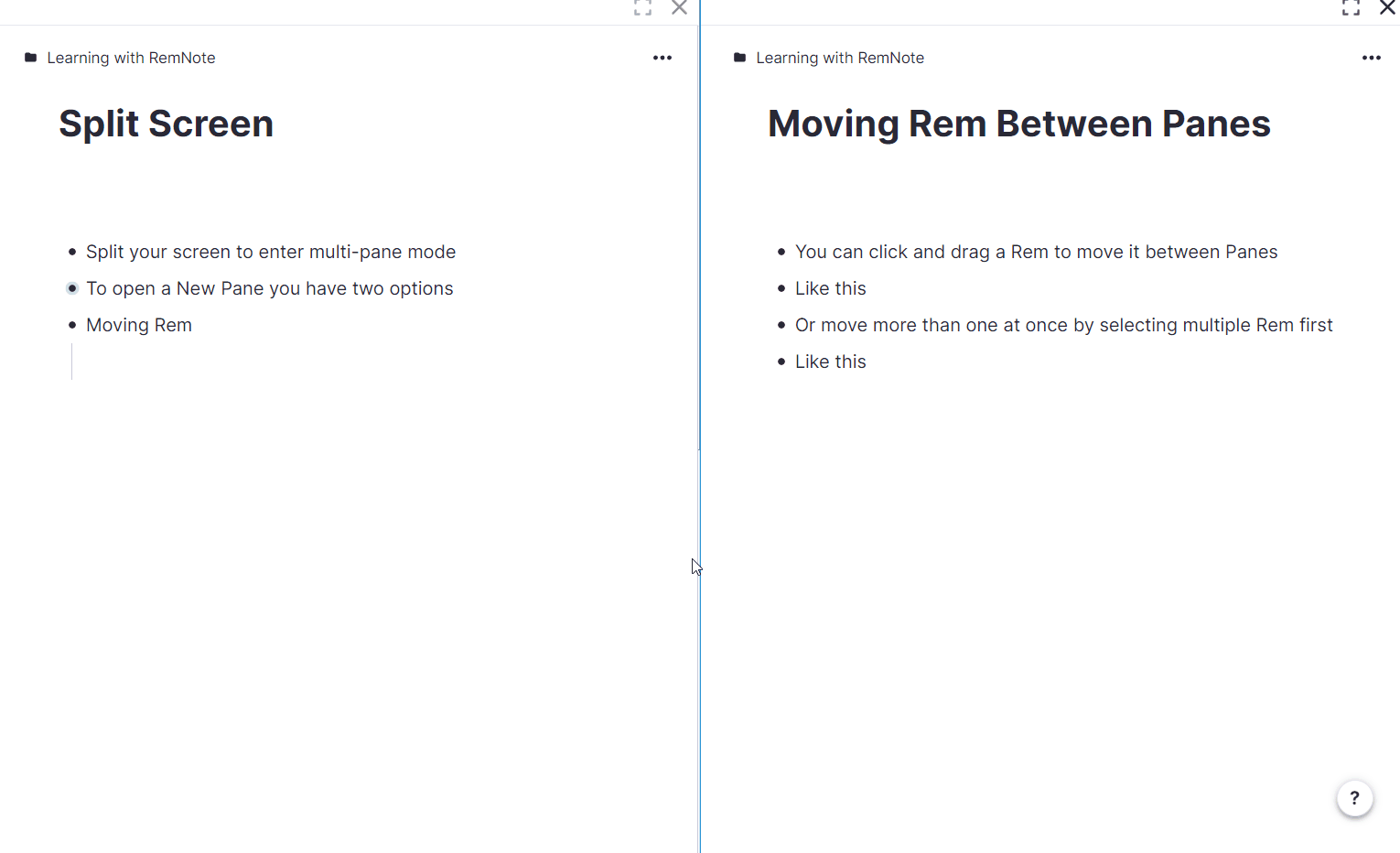 当你打开两个或更多窗格时,可以通过简单的点击和拖放操作在它们之间移动 Rem。你甚至可以选中多个 Rem 并同时移动它们。只需高亮选中所有想要移动的 Rem,然后点击并拖动即可。