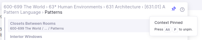 在上述《A Pattern Language》的例子中,我们可能会发现自己在记笔记时反复在相同的上下文中搜索和/或创建 Rems(在本例中,是书籍文档的 Patterns 部分)。每次都要反复导航到该部分很快就会变得很烦人!在这种情况下,你可以按 Alt+P(在 Mac 上是 Opt+P)来固定搜索上下文。右上角会出现一个蓝色的图钉图标: