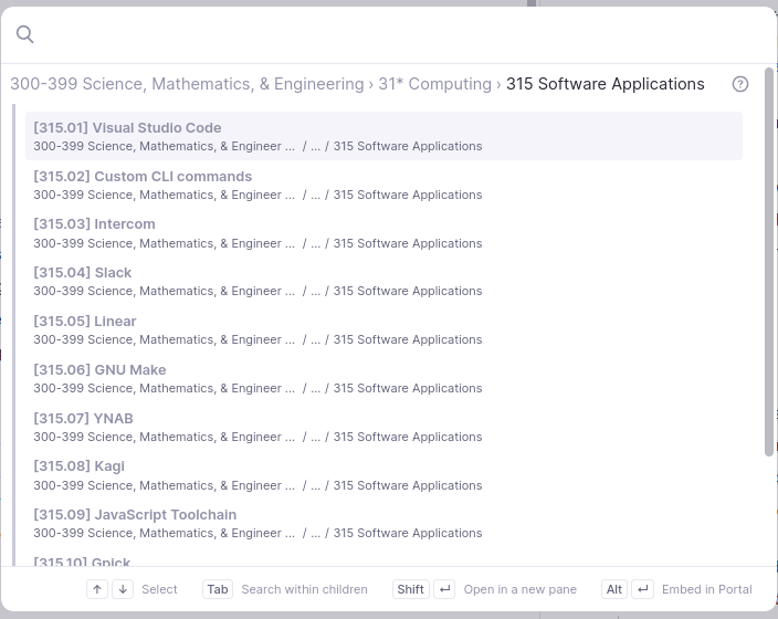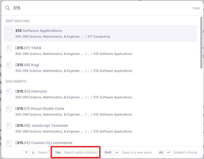 3. 你可以按 Shift+Tab 键向返回一级到当前 Rem 的父级。(这将允许你超越最初选中的 Rem——在上面的例子中,即使我是在 Rem 315 Software Applications 上开始的层级搜索,如果需要,我也可以按 Shift+Tab 向上到 31* Computing。)如果你一直按 Shift+Tab 直到顶层,层级搜索将退出,你将再次进行普通搜索。