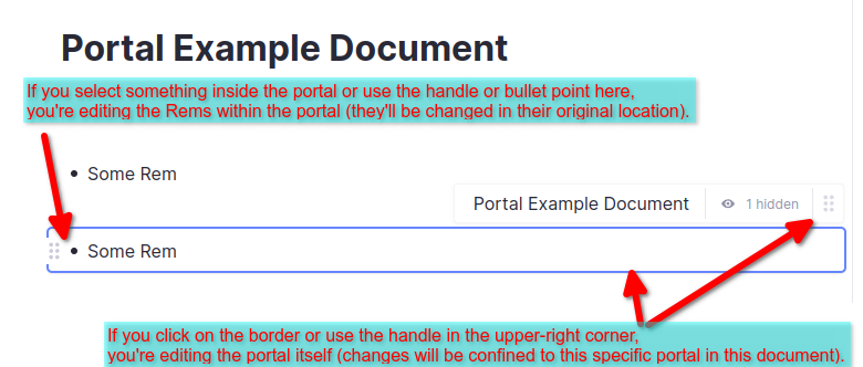 使用传送门时的一个重要区别是,你是在编辑传送门本身还是传送门内的 Rem。例如,如果你想删除某些内容,你可以删除传送门(这只会将其从当前文档中移除,并将其中的所有 Rem 保留在原始位置),或者删除传送门的内容(这将在整个知识库中移除它们)。