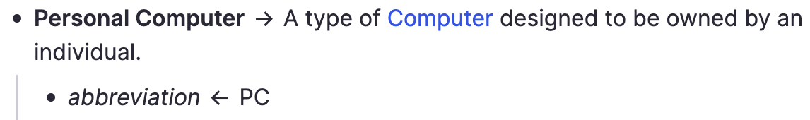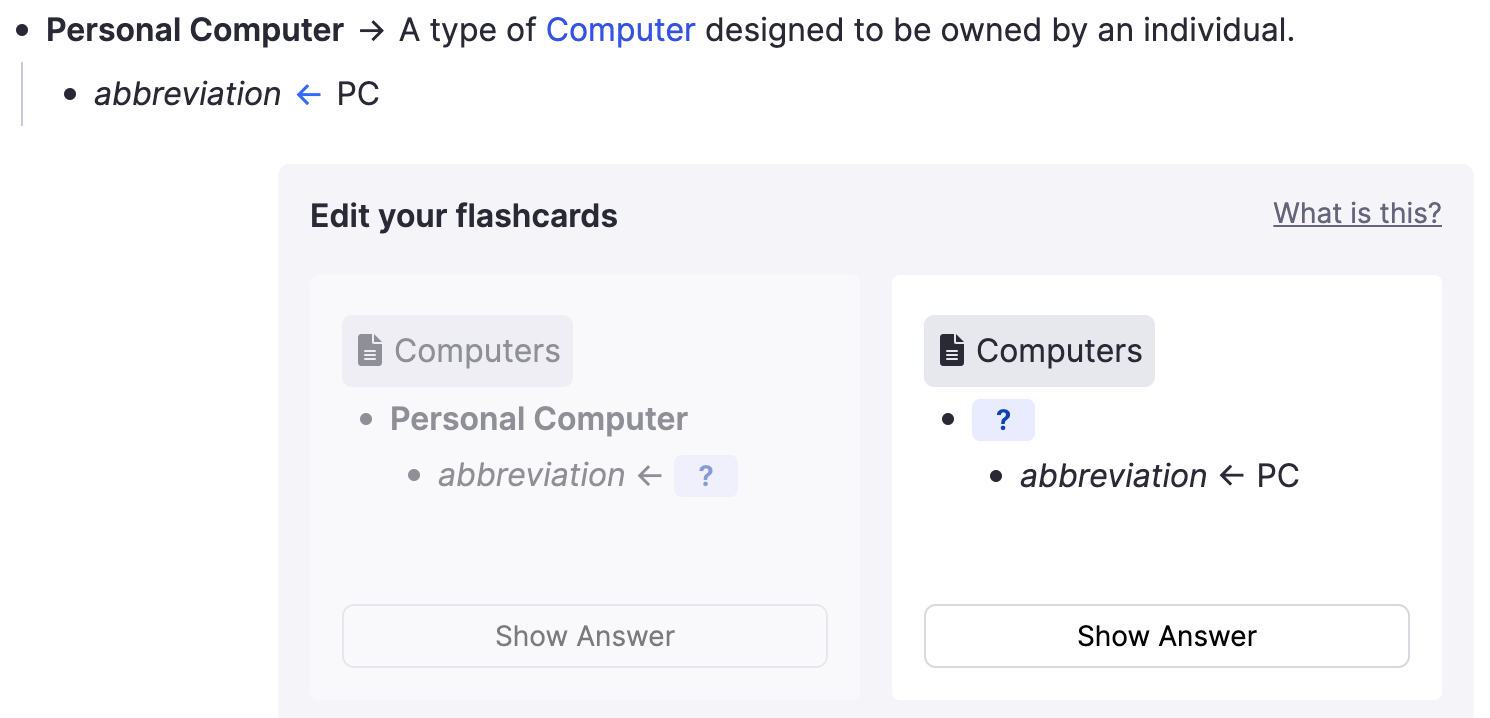 在记忆卡片上显示个人计算机的上下文和 PC 的背面,并要求你解释 PC 是个人计算机的缩写——这在实际生活中并不是你可能会被测试的内容!但是,显示 PC 是某物的缩写,并要求你回答那个某物是什么,这非常有用,而 RemNote 在这里正是这样做的: