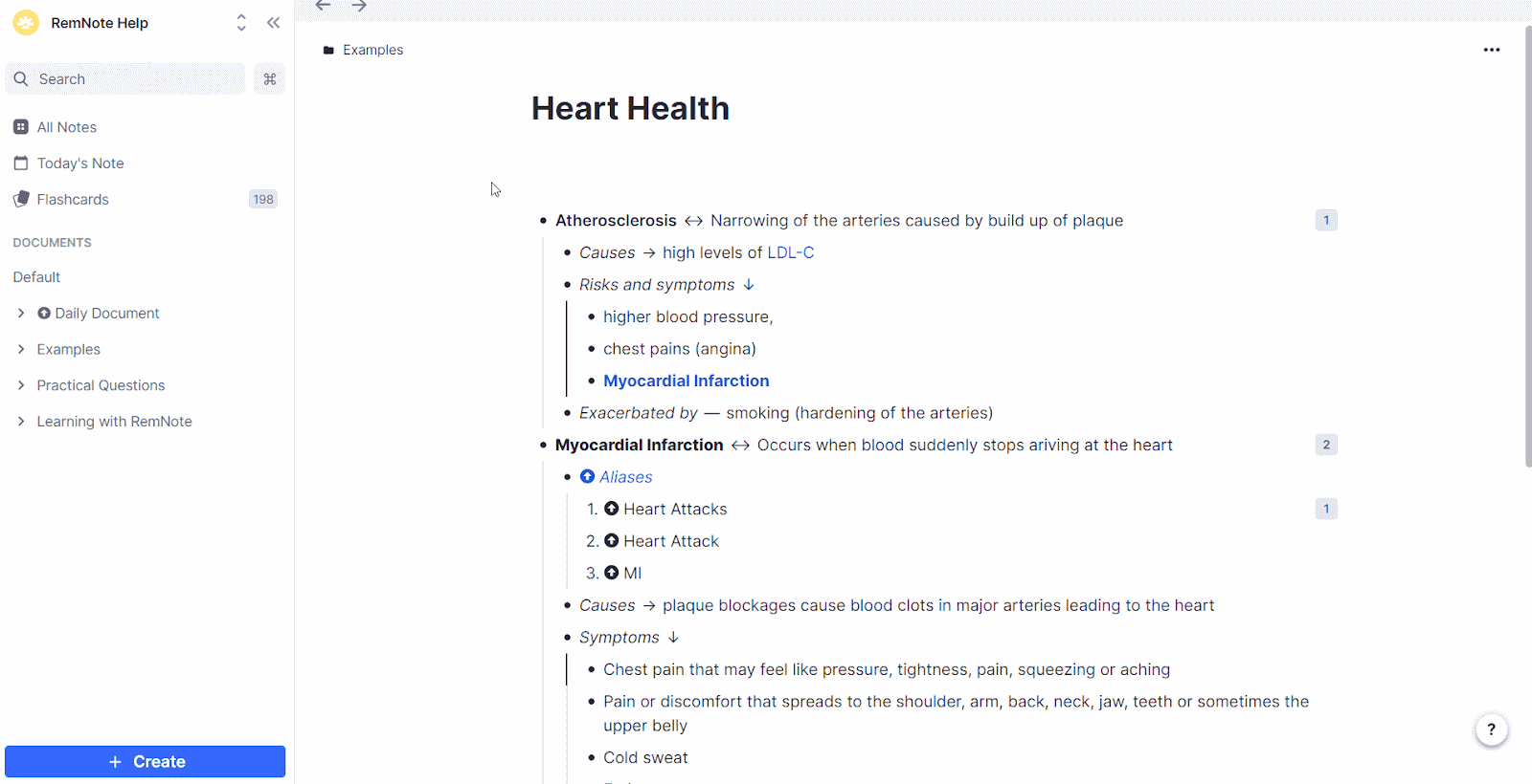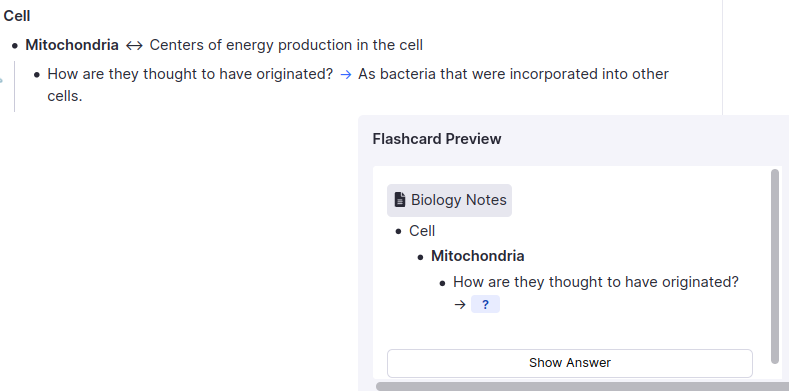 • 在记忆卡片的正面和背面之间输入 ::。如果你计划添加定义,这个方法很方便;你可以输入概念名称,然后输入 ::,接着是定义,这样你将同时创建一张记忆卡片并将该笔记转换为一个概念。