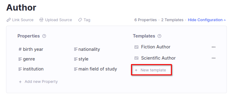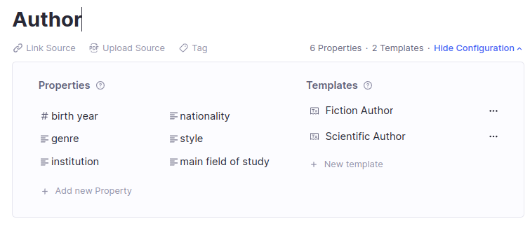 因此,您可以自由地将其中任何一个属性用于任何作者。通过将它们放在特定的模板上,我们只是控制它们自动添加到哪些作者实例中。例如,一个小说作者很可能有一个关联的机构,或者一个科学作者可能有一个值得注意的特定风格,如果我们愿意,我们可以自由地将该属性添加到这样的作者中。但我们不会自动被提示填写它;我们会在确实有意义的情况下手动添加它。