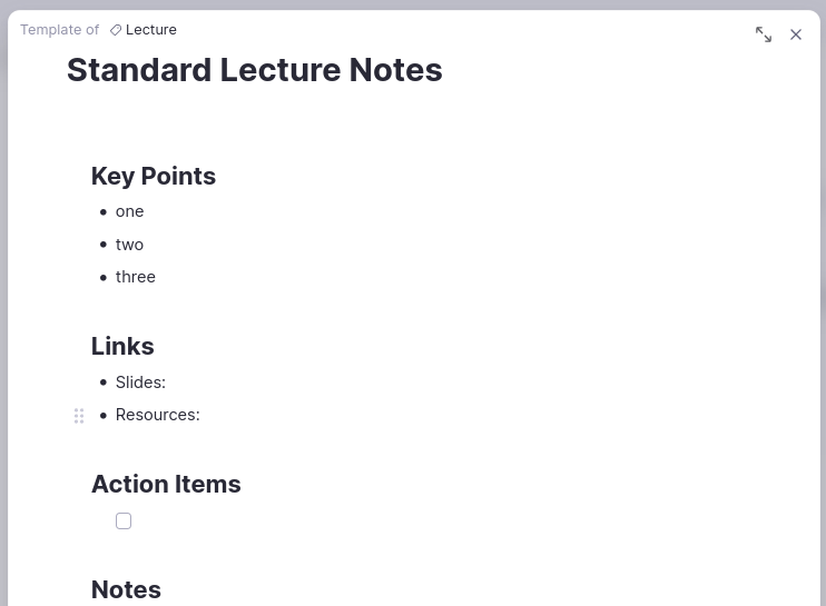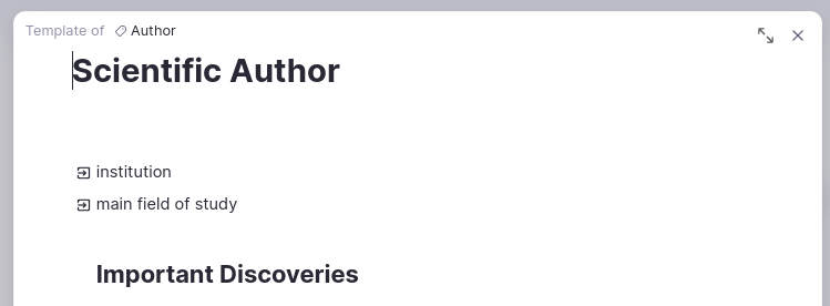 通常,我们希望在整个知识库的许多地方为笔记使用相同的结构。我们想要重复的结构可能针对的是单个想法或对象(化学元素、人物、药品),也可能是某种类型的笔记(特定日期日志页面中需要填写的提示、关于需要完成的新项目要记录的信息)。模板允许您定义此类结构,并可根据需要方便地复制它们。