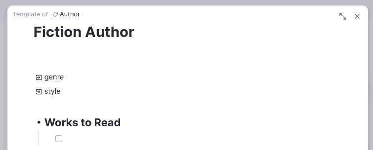 我们将把出生年份和国籍保留为“作为项目符号”属性,直接放在“作者”标签上,因为这些对所有作者都相关。然后,对于小说作者,我们将添加额外的流派和风格属性,并开始一个“待读作品”的待办事项列表: