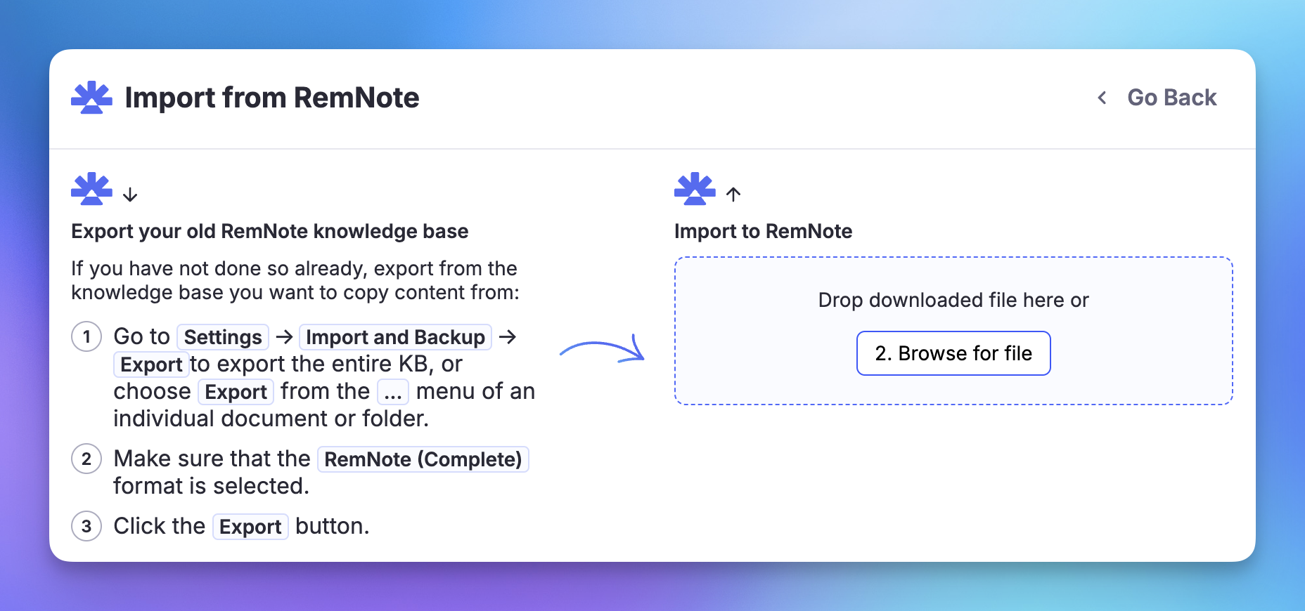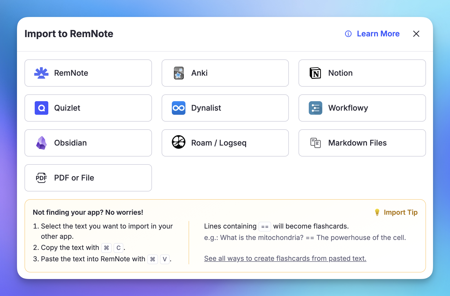 你可以通过点击 RemNote 左上角的用户名并选择导入,来导入从 RemNote 导出的笔记(作为存储在 .rem 文件中的备份,或作为存储在 .db 文件中的知识库),或者从许多其他笔记和记忆卡片应用中导入笔记。