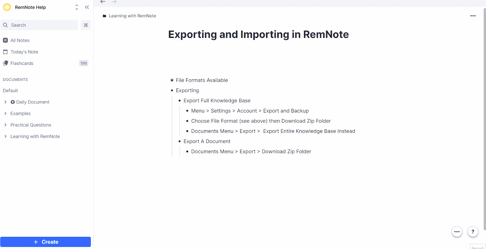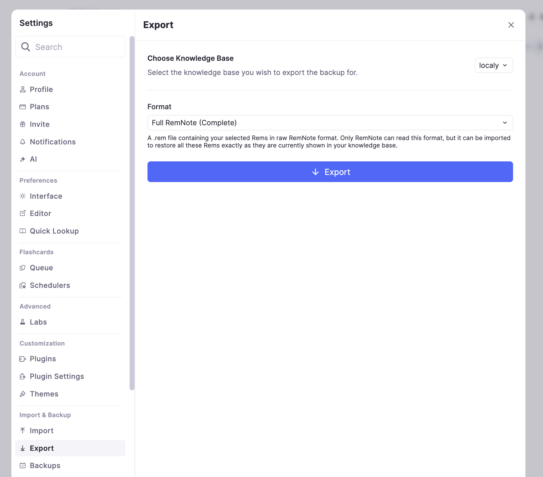 • RemNote(完整): RemNote 原生格式。它可以被导回 RemNote 而不会丢失任何信息。但请注意,它目前不包含图像或 PDF。这些媒体文件保存在 RemNote 的服务器上,因此这通常只在从本地知识库导出时才会成为问题;更多信息请参阅该处。