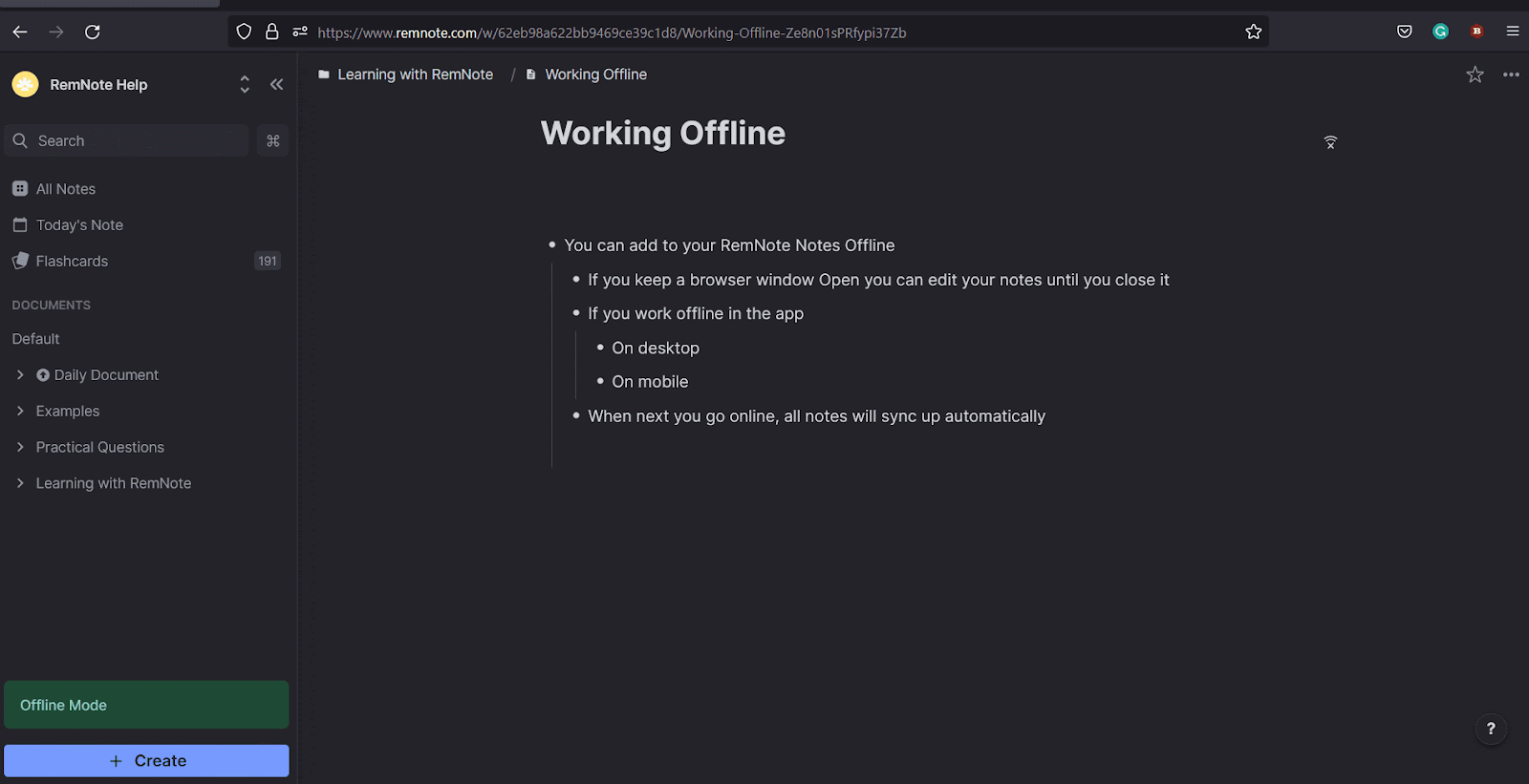 如果你习惯在浏览器窗口中处理笔记,你可以在离线时保持该窗口打开。RemNote 会告知你正处于离线模式,并且你可以继续记笔记,直到关闭窗口。