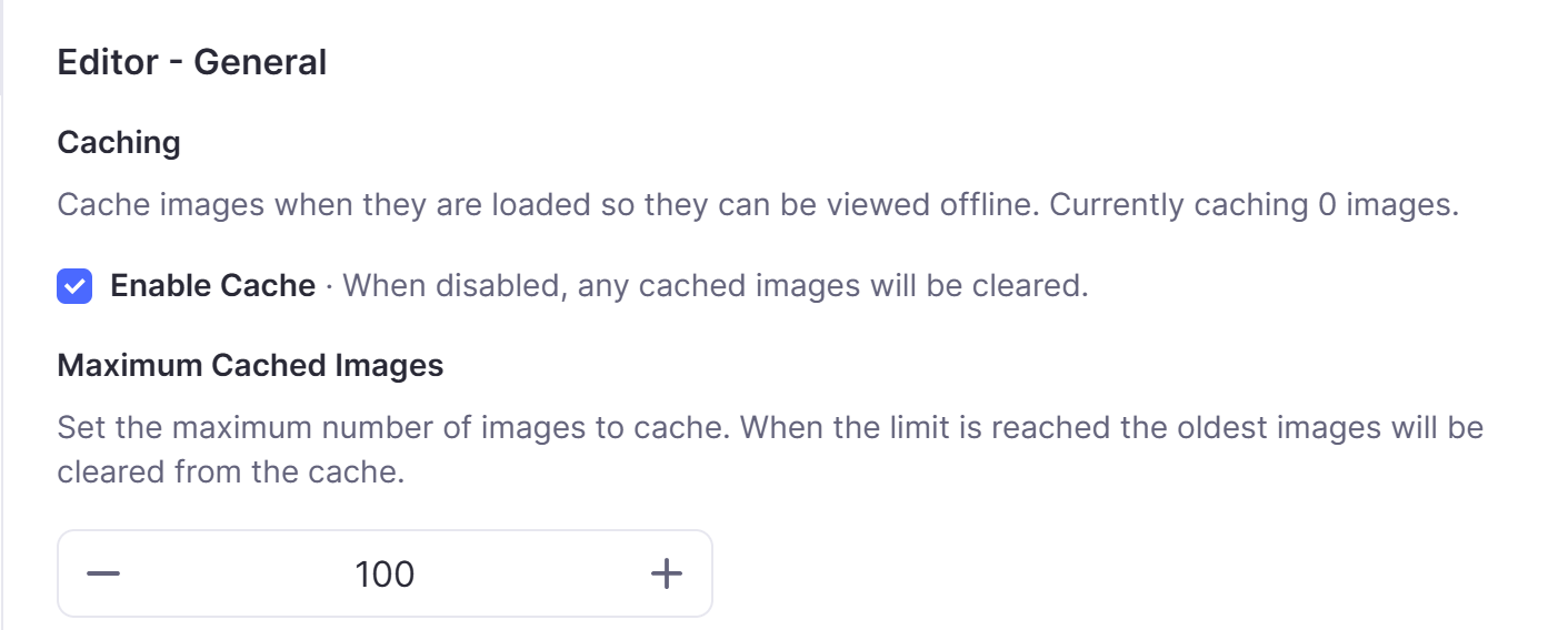 桌面应用会在你电脑的硬盘上存储知识库中所有图像和 PDF 的完整副本,因此你可以在离线时继续使用它们。移动应用和网页应用由于大多数移动设备可用存储空间较小而不这样做,因此你可能无法访问某些媒体文件。但是,它们会缓存一定数量的最近使用的图像,这样你就可以离线访问它们;你可以在 编辑器 > 通用 中更改缓存大小。