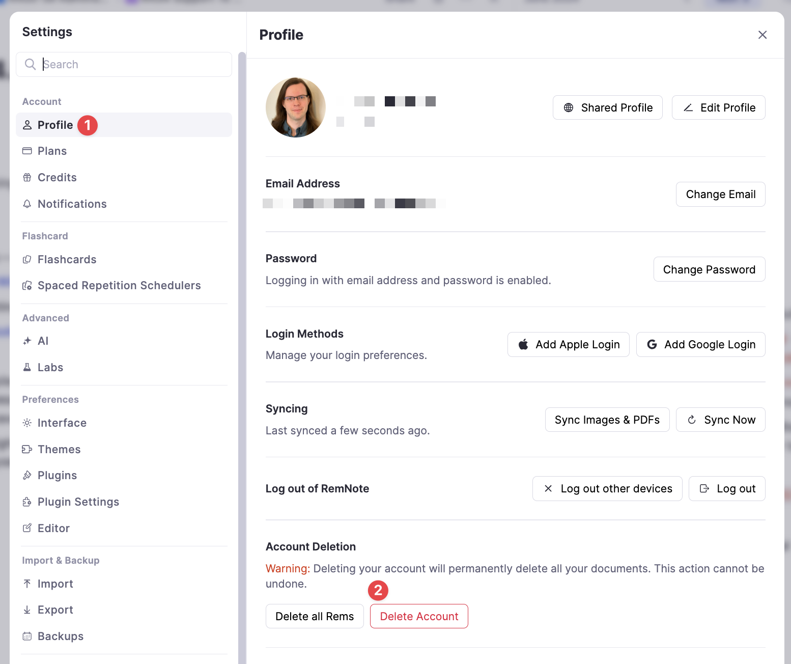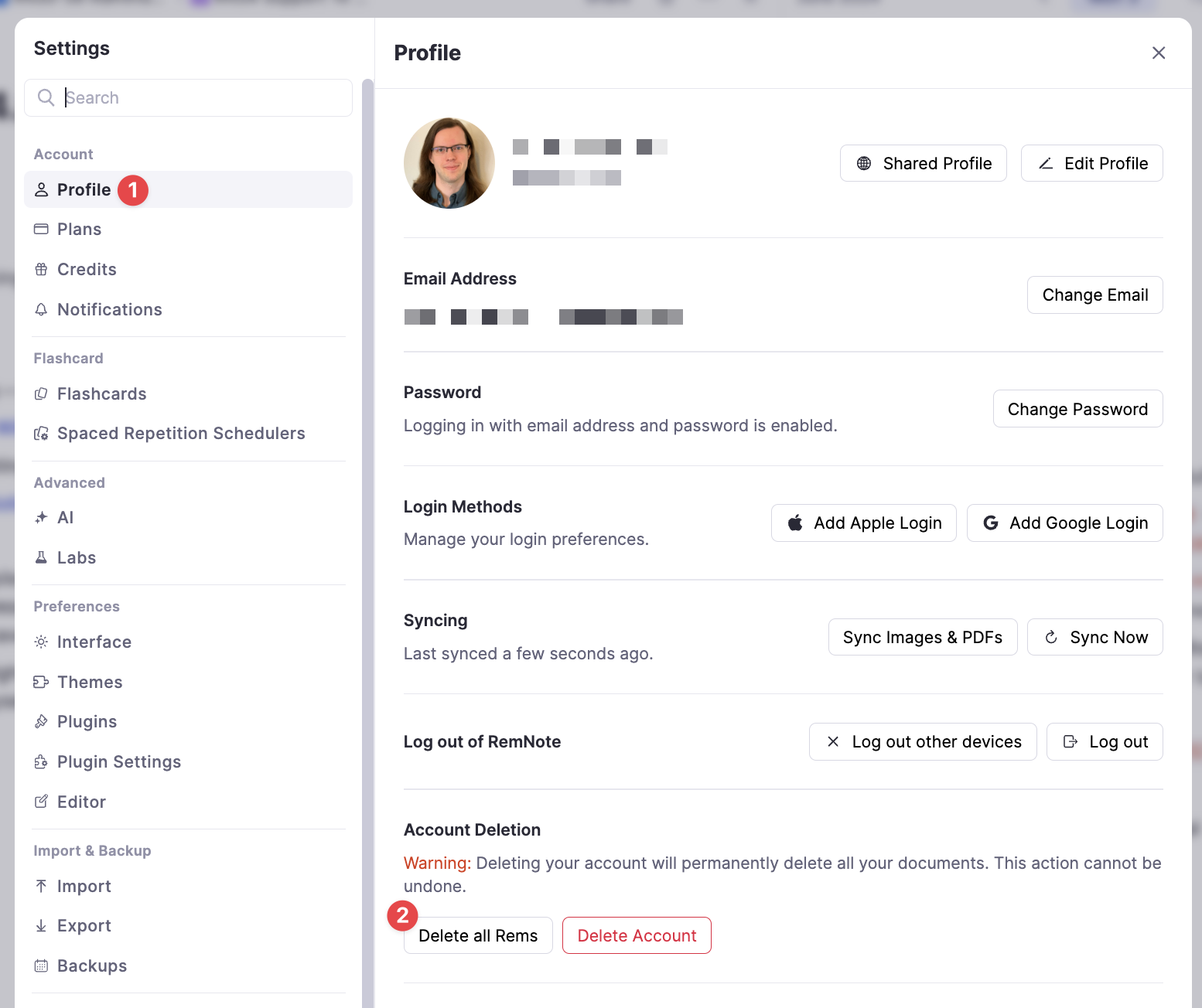 如果您计划继续使用 RemNote,但只是想重新开始,您可以选择在设置 > 个人资料 > 账户 > 账户删除 > 删除所有 Rem中删除当前打开的知识库中的所有 Rem。您的账户将保持活跃状态,但所选知识库中的所有笔记都将被删除。