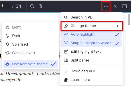 默认情况下,RemNote 阅读器在显示 PDF 和其他文档时,会使用与 RemNote 界面其他部分相同的暗黑模式设置。有时这会使文档难以阅读,或者你可能更希望为文档使用不同的配色方案。你可以通过阅读器菜单上的更改主题选项来覆盖文档的配色方案: