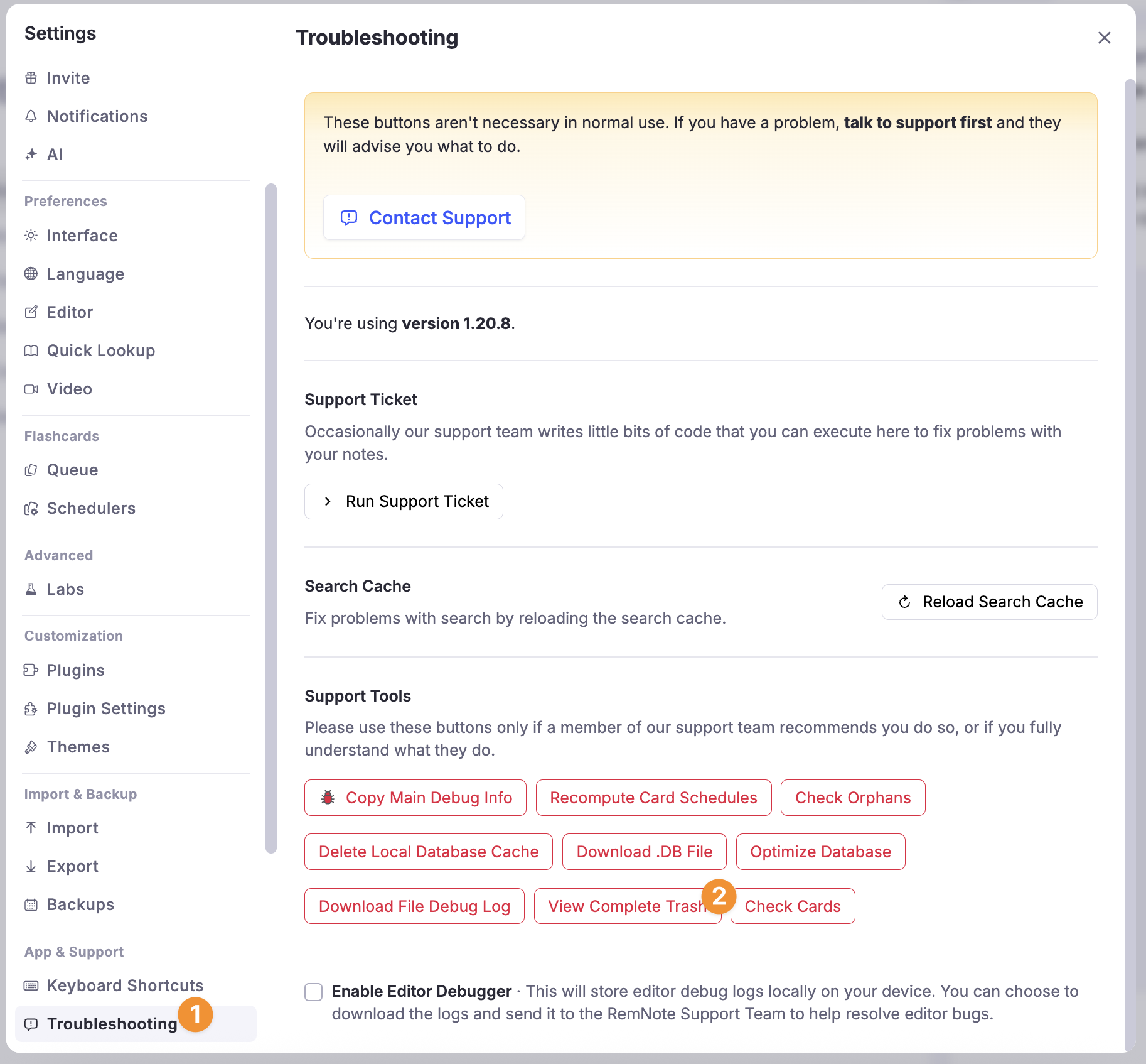 除了常规回收站,也请通过此按钮检查“完整回收站”,前往 设置 > 故障排除 > 查看完整回收站。 被程序错误删除的 Rem 会出现在这里。