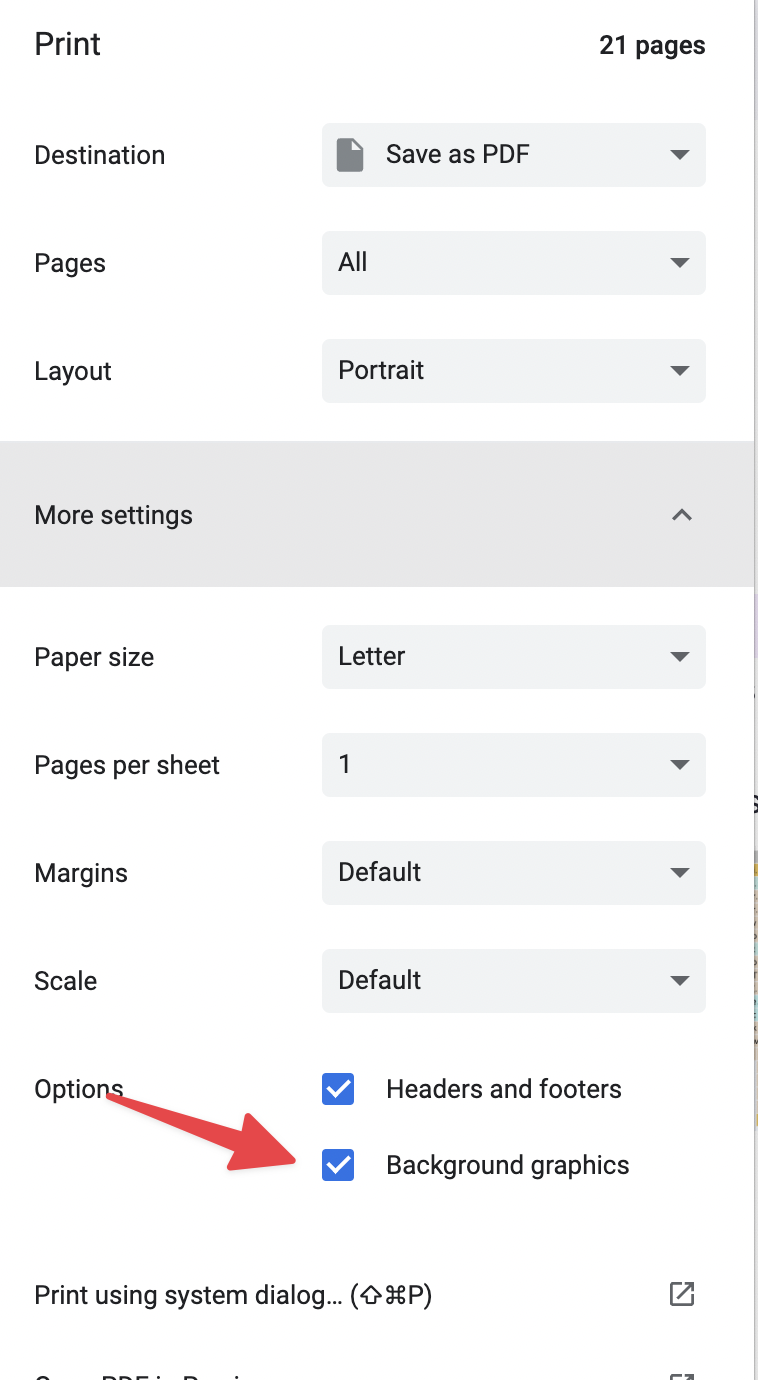 如果这对您的打印机来说不是问题,并且您希望包含高亮,您可以在打印选项中启用 背景图形,以同时打印高亮颜色。请注意,这仅在 Google Chrome 浏览器中有效。