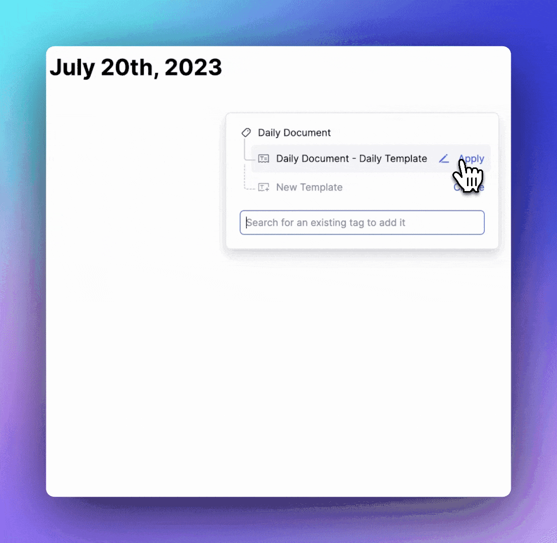 你可能希望每天向新的今日笔记添加相同的内容。你可以通过向 Daily Document Power-up 添加模板来实现这一点。然后,你可以通过点击今日笔记标题下的 Daily Document 标签并选择一个模板来应用它,或者将模板设置为自动应用,以便自动添加到每天的文档中!查看上面的链接以获取有关模板的更多信息。