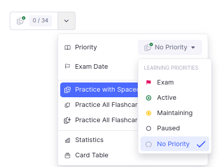 如果你仍希望将这些文档保留在知识库中供参考,但不想再练习它们的记忆卡片,或者想减少练习频率,你可以使用文档右上角的优先级下拉菜单,将文档的优先级降低为暂停或维持:
